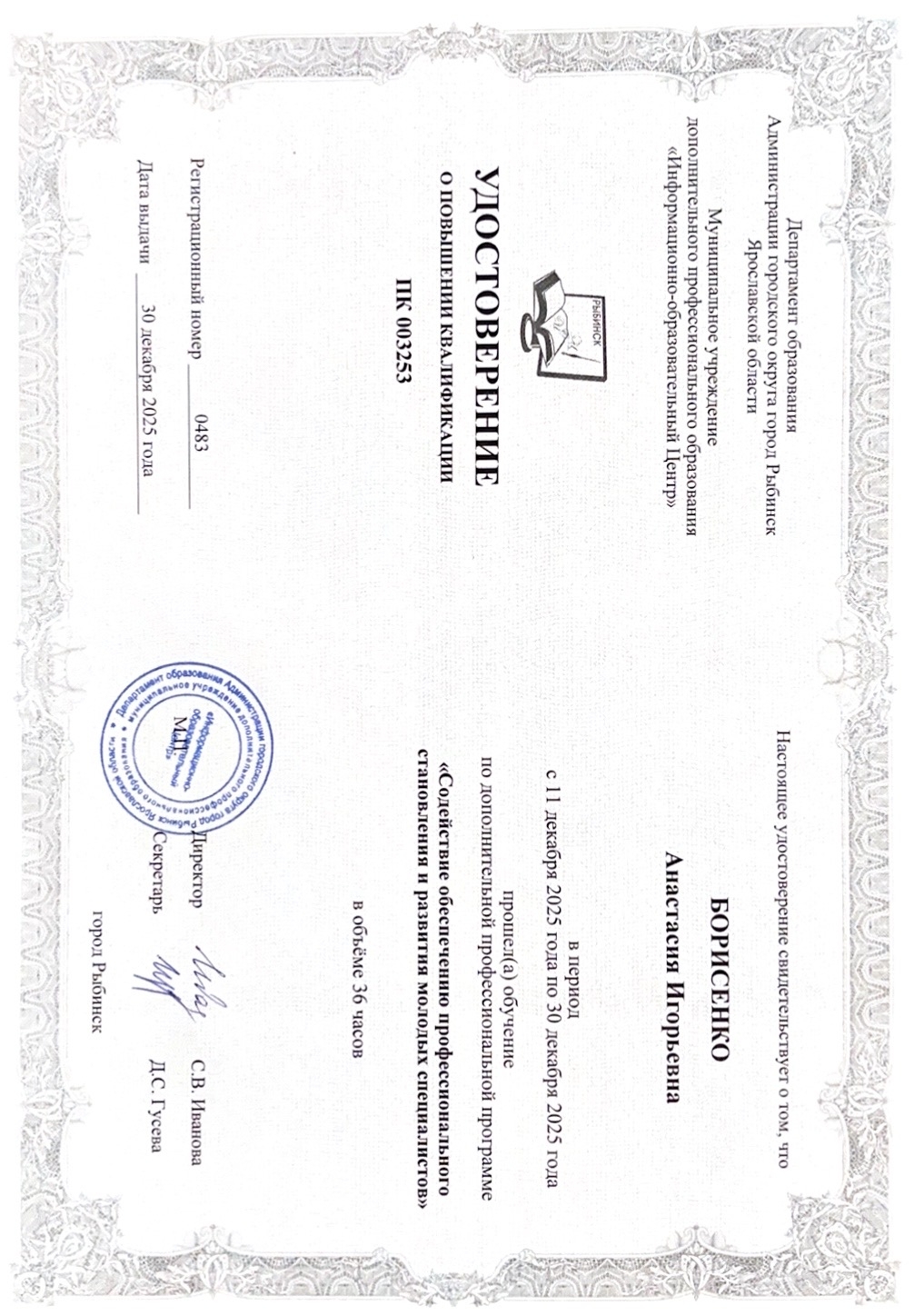 - (скачать) Udostovereniekurs.jpg . . 1448 × 1017 . . 692 КБ . . Борисенко Анастасия Игорьевна . . 21:54, 15 марта 2026